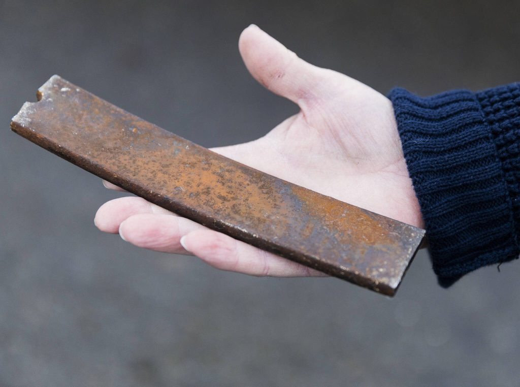 O’Leary shows the piece of metal that flew through the driver’s side windshield of his bus on Friday, Feb. 14, 2025 in Bothell, Washington. (Olivia Vanni / The Herald)