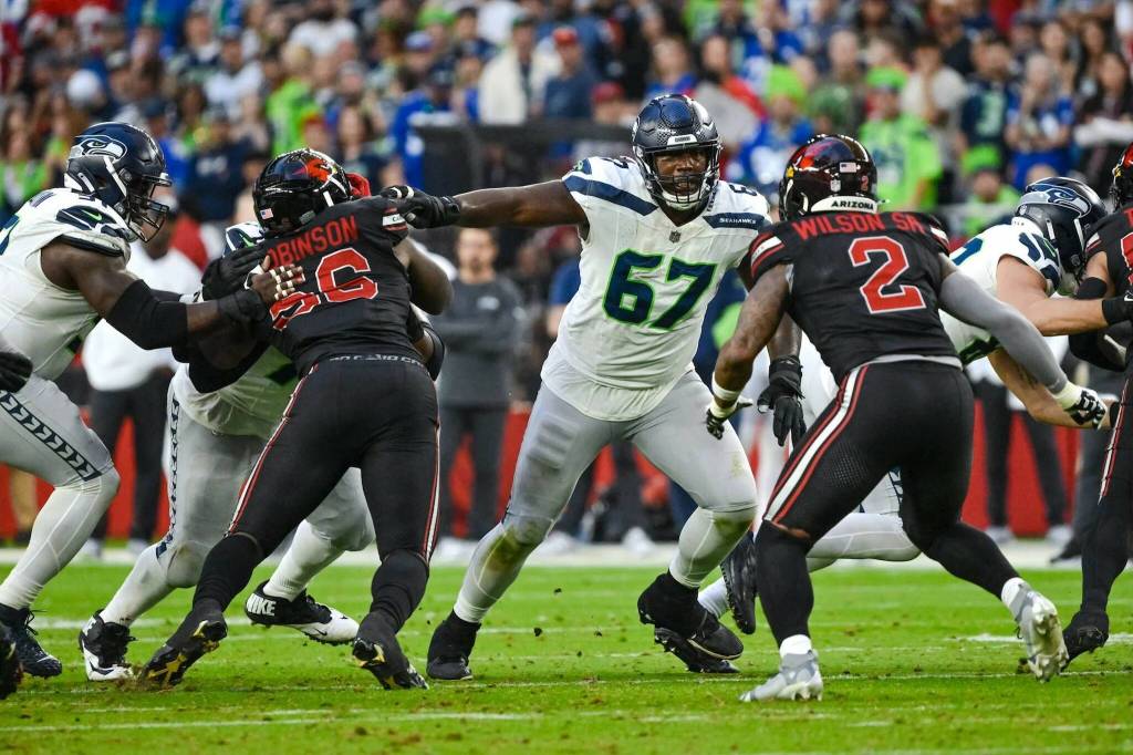 Seahawks left tackle Charles Cross (67) and his fellow offensive linemen block against the Arizona Cardinals at State Farm Stadium on Sunday, Dec. 8, 2024. Seattle has not addressed interior offensive line issues during the first few days of free agency negotiations. (Photo courtesy of Edwin Hooper / Seattle Seahawks)