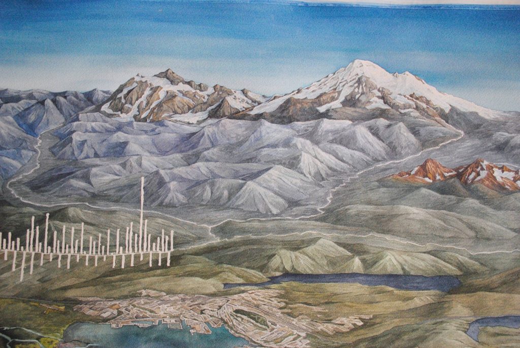 One of Pelto’s new pieces for the exhibit will highlight glaciers that feed into the Skykomish and Snohomish river basins. Her paintings depict the mountains surrounding the town of Index — including Columbia Peak with Columbia Glacier and Lake Blanca nestled between its slopes.