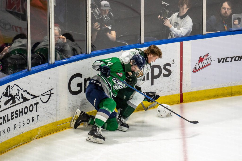 After doubling the Silvertips’ shot total 16-8 in the first period, Seattle remained ahead the entire game. But the two sides traded chances back-and-forth down the stretch. Kaplan nearly got the winner just 58 seconds into the third period, getting a good look on Ratzlaff off the rush, but glanced the puck off his shoulder and out. Kaplan would have to wait 42 more minutes.