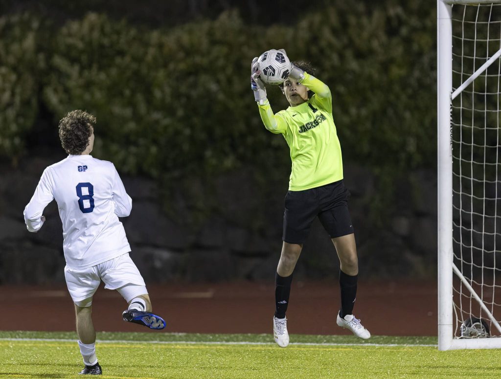 The ball arched up into the air and started descending towards the back of the net, but Jackson goalie Karson Ghosh got his hands on it to block it out over the crossbar. After fending off the ensuing corner kick, Jackson moved the ball upfield and dissected the Glacier Peak defense before senior defender Connor Huynh finished it off to make it 1-0 less than two minutes before the break.