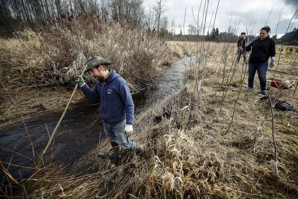 Zachary Mallon, an ecologist with the Adopt A Stream Foundation, checks the banks of Catherine Creek in Lake Stevens for a spot to live stake a willow tree during a volunteer event on Saturday, Feb. 10, 2018. Over 40 volunteers chipped in to plant 350 trees and lay 20 cubic yards of mulch to help provide a natural buffer for the stream.