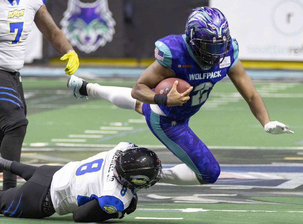 Washington Wolfpack's Ed Crouch Jr. leaps to try and escape a tackle by Nashville Kats' Derrick Maxwell Jr during the game on Thursday, April 17, 2025 in Everett, Washington. (Olivia Vanni / The Herald)