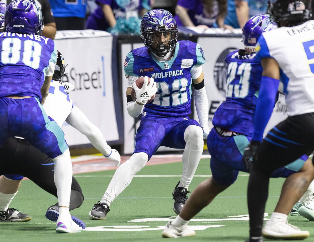 Washington Wolfpack’s Caleb Brown looks for an opening as he runs the ball during the game against the Nashville Kats on Thursday, April 17, 2025 in Everett, Washington. (Olivia Vanni / The Herald)