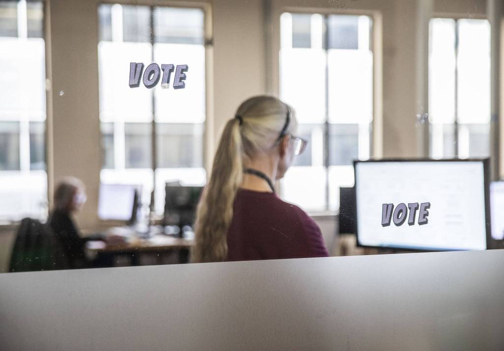 Snohomish County Elections employees check signatures on ballots as an important verification step on Oct. 29, 2024 in Everett. (Olivia Vanni / The Herald file photo)