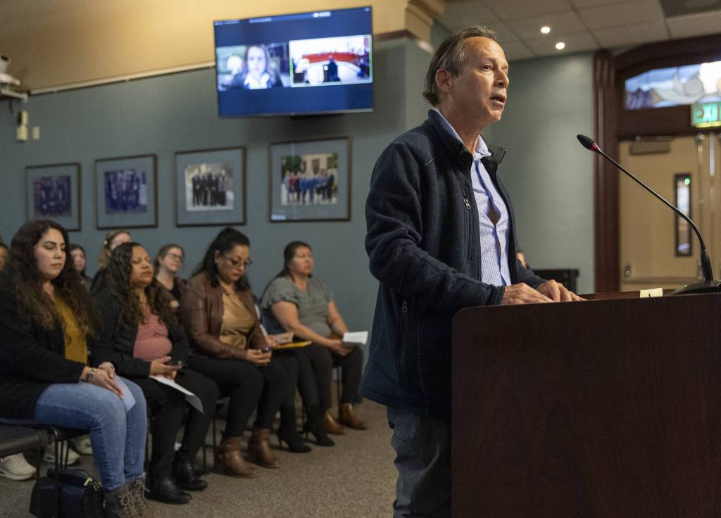 Connect Casino Road Director Alvaro Gullien speaks at an Everett City Council meeting to share community thoughts regarding affordable housing and preventing displacement of those who live along Casino Road on Wednesday, April 16, 2025 in Everett, Washington. (Olivia Vanni / The Herald)
