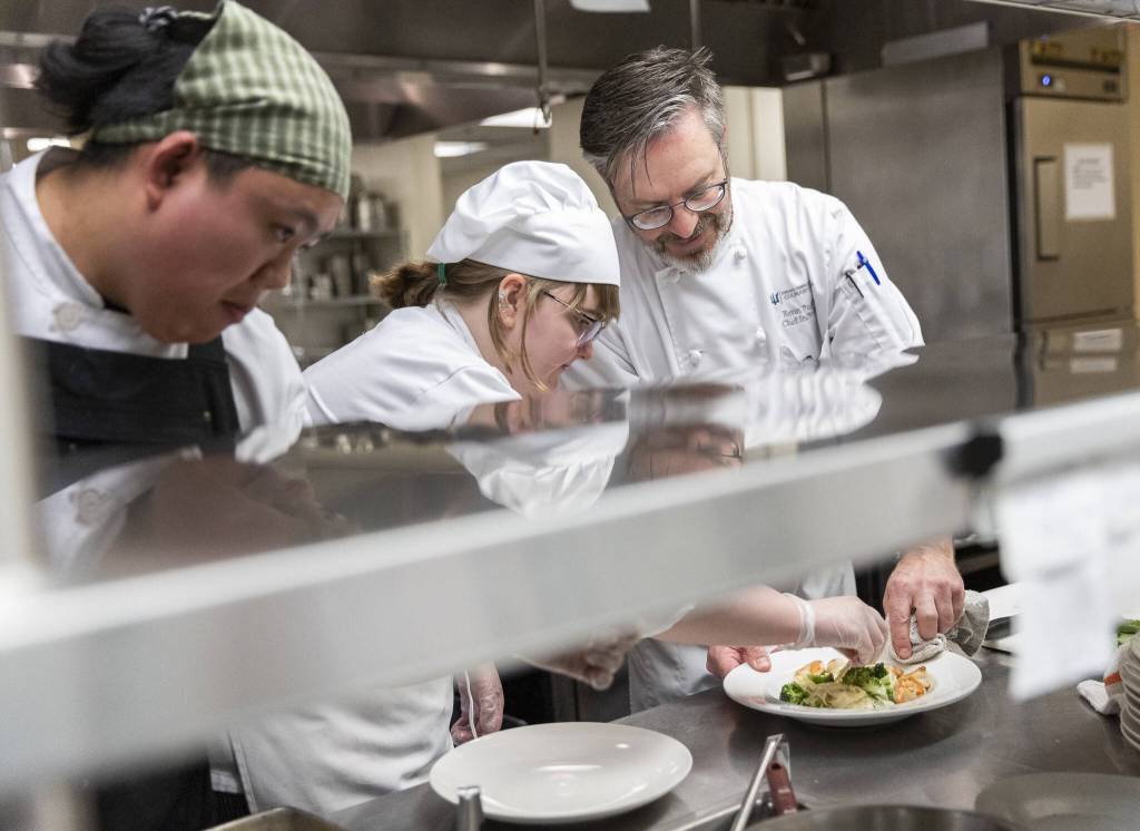 Nathan Tri, left, Natalie Lessley, center, and Chef Instructor Kevin Fogerty plate a fettuccine alfredo with saute shrimp and broccoli at the Edmonds College Cafe on Thursday, May 29, 2025 in Edmonds, Washington. (Olivia Vanni / The Herald)