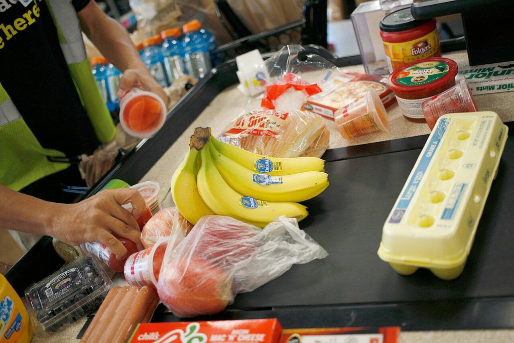 An employee bags groceries for a customer at a checkout counter inside a grocery store in 2017. (Bloomberg photo by Luke Sharrett)