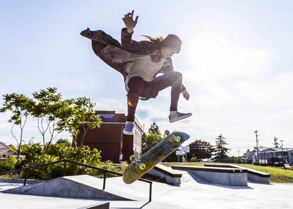 Steven Lindquist does a kickflip off of a set of stairs at the Edmonds Skate Park at the Civic Center on Monday, June 16, 2025 in Edmonds, Washington. (Olivia Vanni / The Herald)