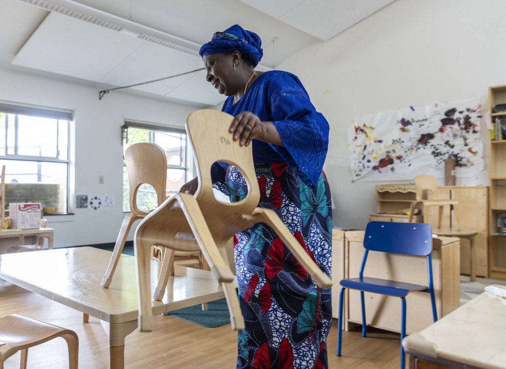 Staff shared emotional goodbyes with one another as former students came to visit. Fatou Dramme-Darboe, a teacher at the center, spent a few minutes stacking up small chairs in her preschool classroom as she cleaned it for the last time.