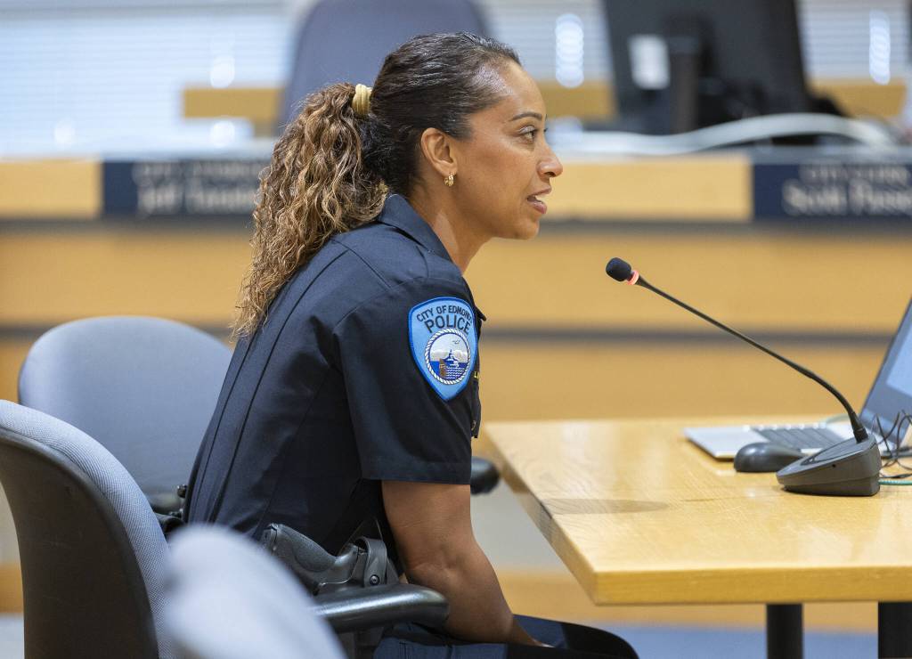 Edmonds Police Chief Loi Dawkins speaks after the city council approved her appointment on Tuesday, July 8, 2025 in Edmonds, Washington. (Olivia Vanni / The Herald)