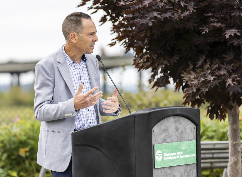 Robin Mayhew, a deputy regional administrator at the Washington Department of Transportation, speaks at a ribbon cutting for the new I-5/SR529 interchange on Tuesday, July 22, 2025 in Marysville, Washington. (Olivia Vanni / The Herald)