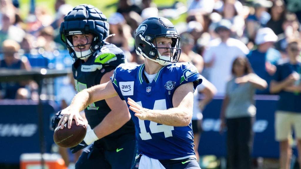 Darnold has noticeably improved over the three weeks since training camp began, particularly in throwing the ball quickly and accurately against Macdonald’s changing defense. Sunday during practice, Macdonald joked with his new quarterback in from a 14-3 season with the Minnesota Vikings in 2024 that he’s been “a pain in the butt” trying to pressure, because Darnold is getting the ball out so quickly and precisely for completions.