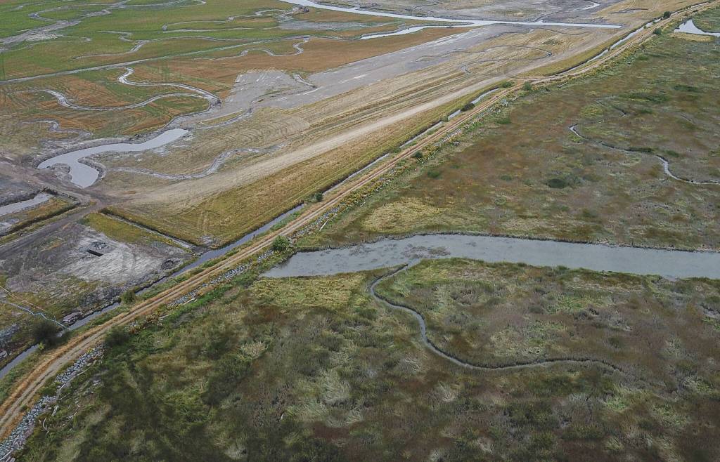 STANWOOD — On the west side of an old dike near Port Susan, seagrass sways along tidal channels as birds dart through cattails. On the east side of the dike, separated by only a few feet of dirt, dust swirls across a flat plain as excavators move mounds of earth.