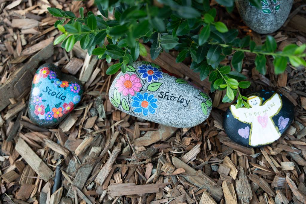 Several painted rocks with the names of people who have passed sit around the wind phone. Many of the names are people who died in the 2014 Oso landslide, which claimed the lives of 43 people.
