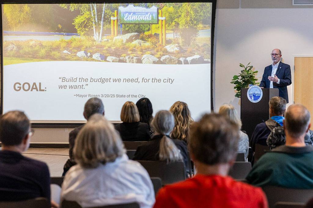 EDMONDS — Edmonds Mayor Mike Rosen presented a budget update to community members at the Edmonds Waterfront Center on Tuesday as the City Council begins work on mid-biennium adjustments.