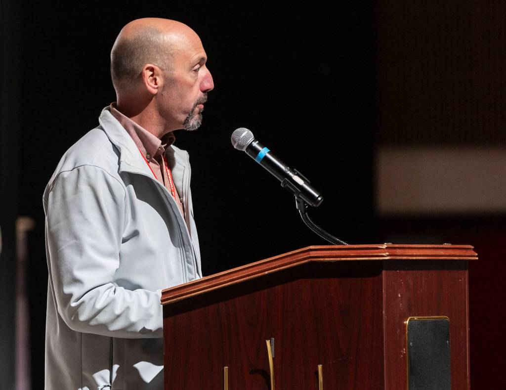 Marysville Pilchuck High School Principal Pete Apple speaks at a mural reveal event on Oct. 14, 2025 in Marysville, Washington. (Olivia Vanni / The Herald)