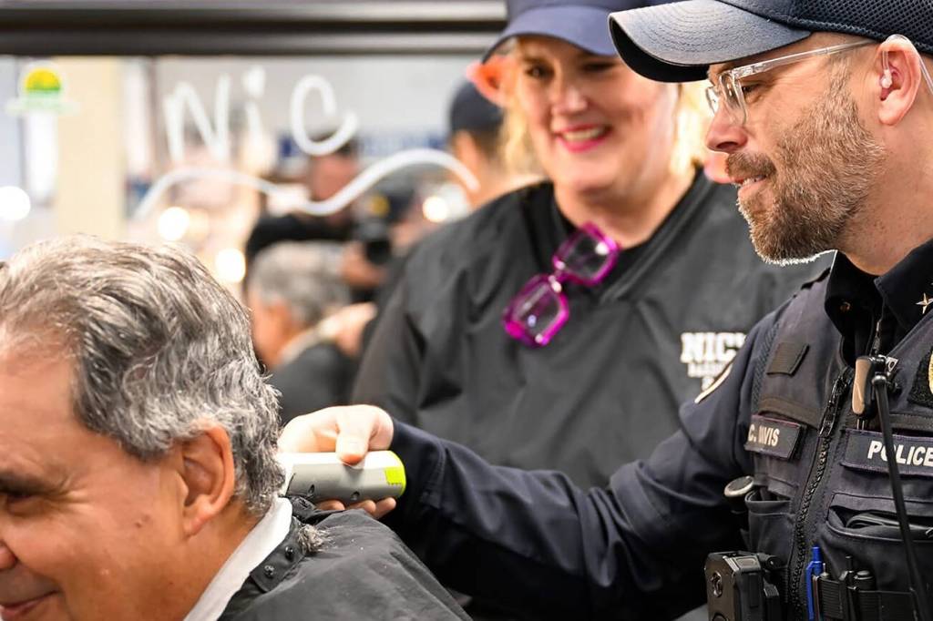 The annual Cuts with Cops event will return to Nic’s Barbershop on November 1 in Mukilteo. Under the supervision of trained barbers, officers will cut attendees’ hair. (Carson Swink)