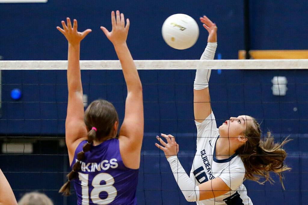SNOHOMISH — The Grizzlies (9-4 overall, 6-3 league) flipped the script on the visiting Eagles (6-7, 5-4), overcoming a two-set deficit with three straight set wins, 23-25, 22-25, 25-18, 25-23, 15-10. Emma Nowak (14 kills, 11 digs) was solid on both ends for Glacier Peak while Alyssa Box (31 assists) and Sydney Dilling (23 assists) powered the comeback effort. Claire Sedenquist led the offense with 20 kills while Keira Trask had nine for the Grizzlies. Arlington had standout performances as well, as Emme Shaffer went for 30 kills and nine digs while Phoebe Potong came up with a game-high 30 digs. Holland Nobach also picked up 21 digs while Grace Armes (18) and Audrey Marsh (19) combined for 37 assists.