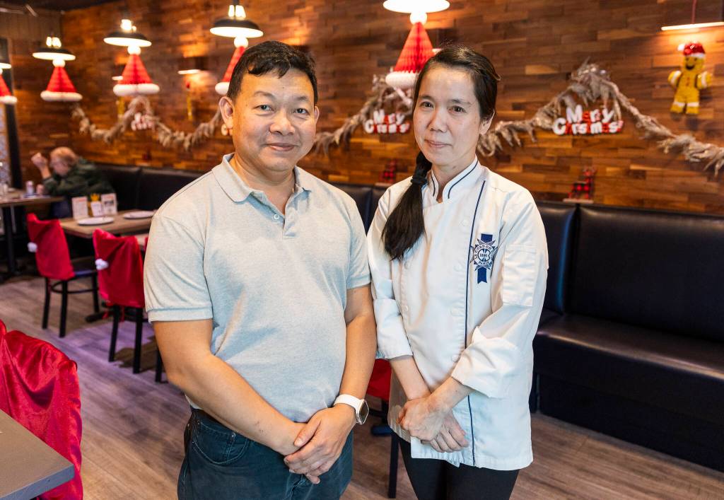 Joe and Jill Ochanta at their restaurant B Thai Cuisine that has received help from Lynnwood’s business advocacy program on Nov. 20, 2025 in Lynnwood, Washington. (Olivia Vanni / The Herald)