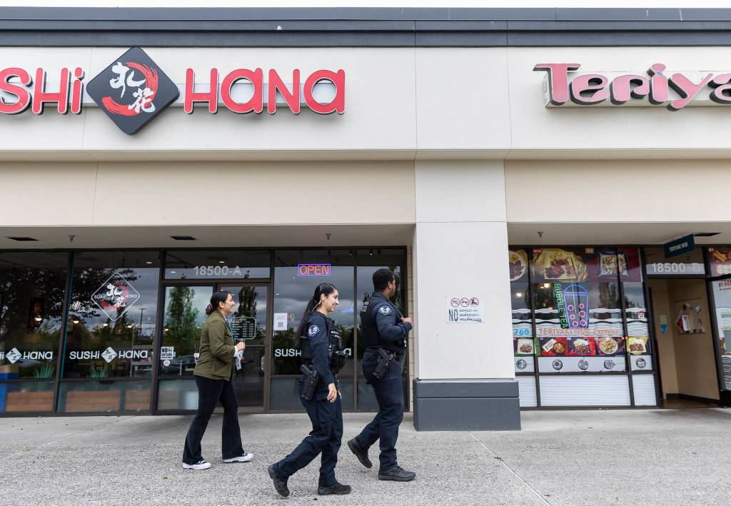 Lynnwood Police Officers AJ Burke and Maryam McDonald with the Community Health and Safety Section Outreach team and City of Lynnwood’s Business Development Program Manager Simreet Dhaliwal Gill talk with a small business owner in the Lynnwood Financial Center on Wednesday, June 25, 2025 in Lynnwood, Washington. (Olivia Vanni / The Herald)