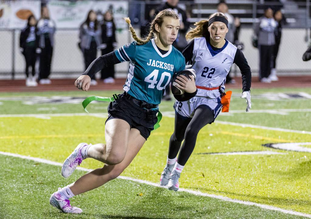 Jackson’s Laila Lowery jumps to avoid having her flag pulled during the game against Squalicum on Wednesday, Jan. 7, 2026 in Everett, Washington. (Olivia Vanni / The Herald)