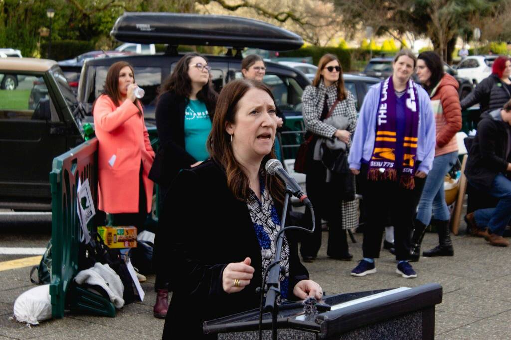Sen. Noel Frame, D-Seattle, speaks at a rally during the 2025 session. Frame has been a leading voice in the Legislature in support of progressive taxes. (Photo by Jacquelyn Jimenez Romero/Washington State Standard)