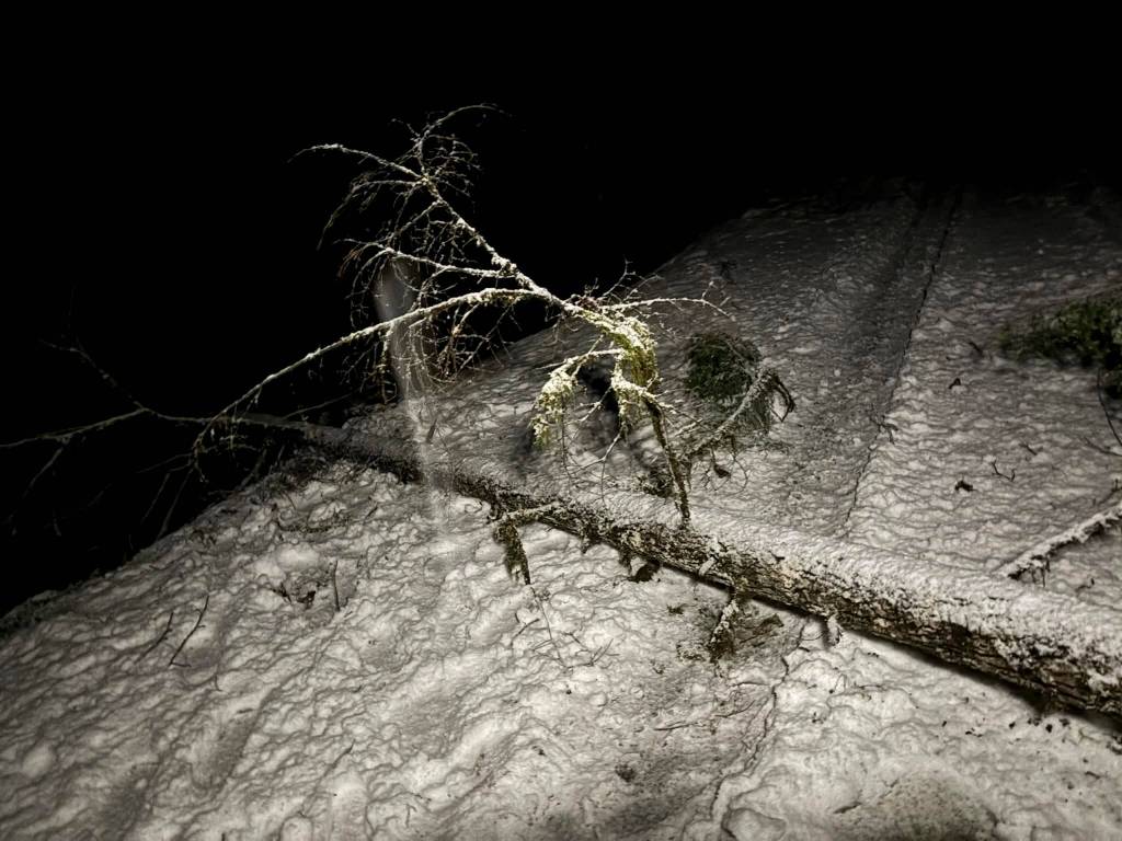 While Trepanier’s vehicle could handle the snow, falling trees made the narrow mountain road difficult to navigate. Trepanier described continually getting out of the car to move trees off the roadway and, on one occasion, dig her Nissan out of the snow.