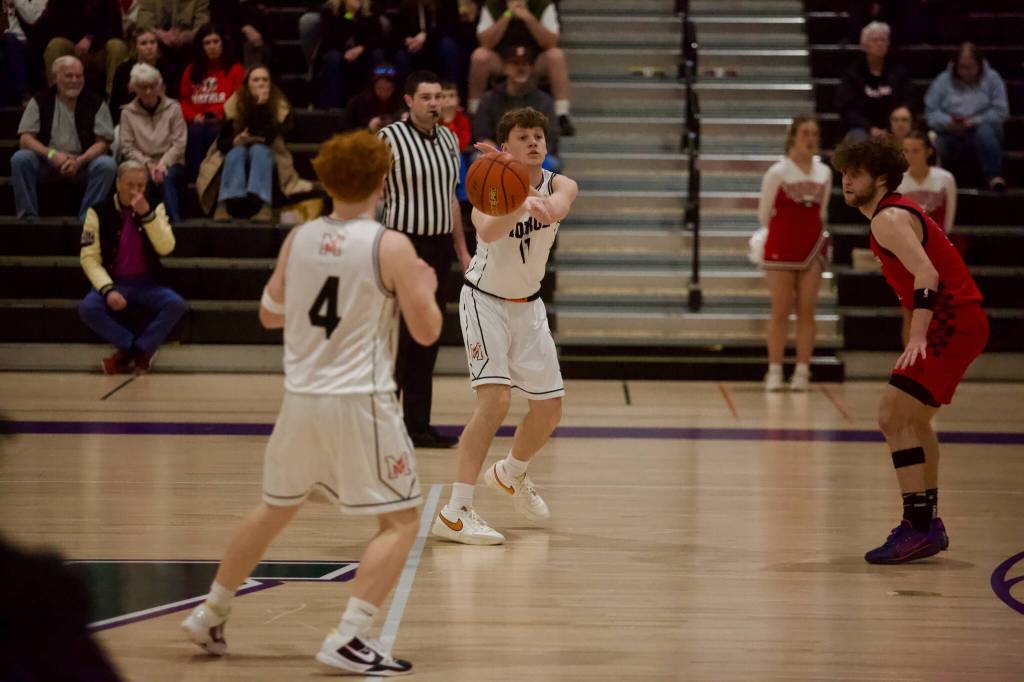 Monroe senior Wyatt Prohn sends a pass to senior Tate Hammerquist (4) during the Bearcats’ 57-54 loss to Snohomish in the District 1 3A semifinals at Edmonds-Woodway High School on Feb. 17, 2026. (Joe Pohoryles/The Herald)