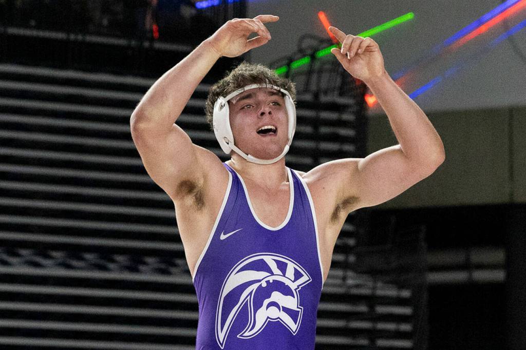 Snohomish’s Odin Schwabenbauer reacts after wining the 3A boys 285-pound championship match at the Mat Classic on Friday, Feb. 20, 2026 in Tacoma, Washington. (Olivia Vanni / The Herald)