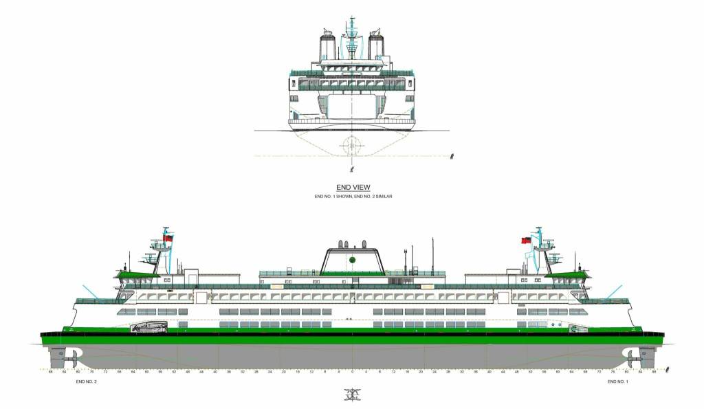 The finalized design drawings depict 460-foot boats that resemble a slightly elongated version of the diesel-powered Olympic class ferries built in Seattle between 2014 and 2018. However, the new design has just one passenger deck stacked on top of the two auto decks.