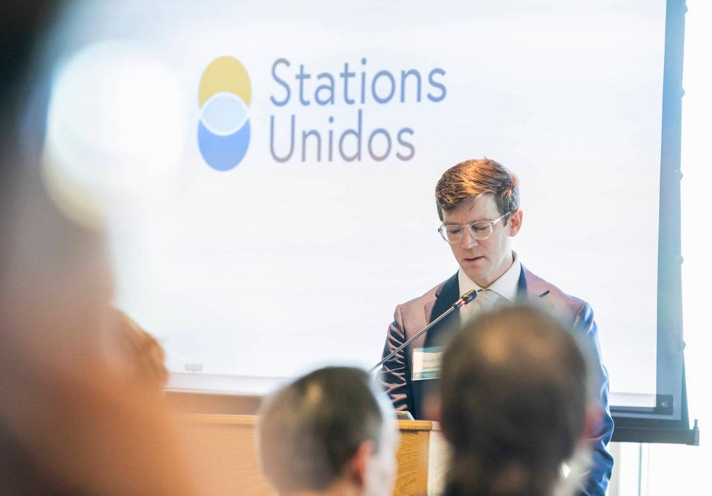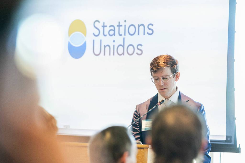 Everett Station District Alliance CEO Brock Howell unveils the new logo and name, Stations Unidos, during a launch event on Tuesday, Feb. 24, 2026 in Everett, Washington. (Olivia Vanni / The Herald)