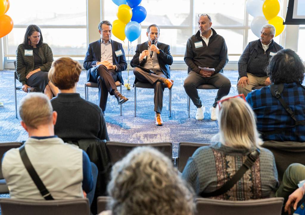 Alvaro Guillen, the director of the south Everett community organization Connect Casino Road, speaks on a panel with Sound Transit’s Chief Planning and Development Officer Marshall Foster, left, Joe Sievers, right, and Ismail Mohammad during a launch event on Tuesday, Feb. 24, 2026 in Everett, Washington. (Olivia Vanni / The Herald)