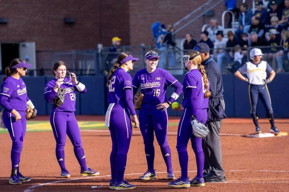 Washington Huskies softball player Alexis DeBoer (16) meets with teammates in the pitching circle at Husky Softball Stadium in Seattle, Washington during a game against Michigan on March 22, 2026. (Photo courtesy of Washington Athletics)