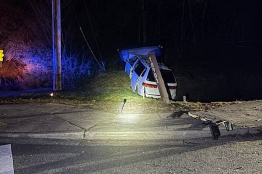 One car struck a power pole during a four-car collision Wednesday, April 8, 2026, in Lynnwood, Washington. (Washington State Patrol)