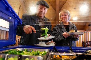 Frank and Nancy Roesler, of Startup, grab a little salad with lunch Jan. 3, two days before their 66th wedding anniversary, at the Sky Valley Senior Center in Sultan. The center, started by a group of seniors with help from Volunteers of America to offer meals, exercise classes and more, has been struggling to keep the lights on, despite a fundraising campaign launched by the VOA. (Dan Bates / The Herald)