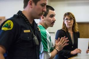 In Snohomish County Superior Court on Tuesday, Jacq Mitchell glances away from the bench momentarily during sentencing for shooting a man in Mukilteo. (Dan Bates / The Herald)