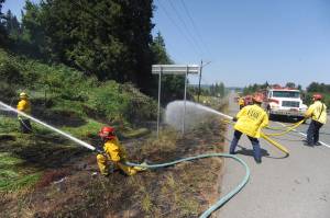Firefighters from five fire districts worked to put out a fast spreading grass fire alongside State Route 9,…