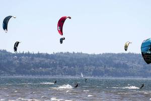 Kiteboarders will take to the surf off Jetty Island