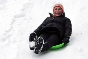 Jody Gasperetti races down a hill at Edmonds City Park  Saturday afternoon on February 13, 2021.  (Kevin Clark / The Herald)