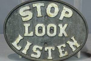 Advising people to stop, look and listen, this old sign is more instructive than newer X-shaped railroad crossing…
