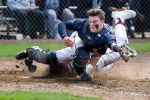 Arlington's Jack Sheward is hit in the leg as O'Dea's David Sessoms slides in for the tying run as Arlington lost 7-6 to O'Dea in a 3A baseball state regional game at Sherman Anderson Field on Saturday, May 18, 2019 in Mount Vernon, Wash. (Andy Bronson / The Herald)
