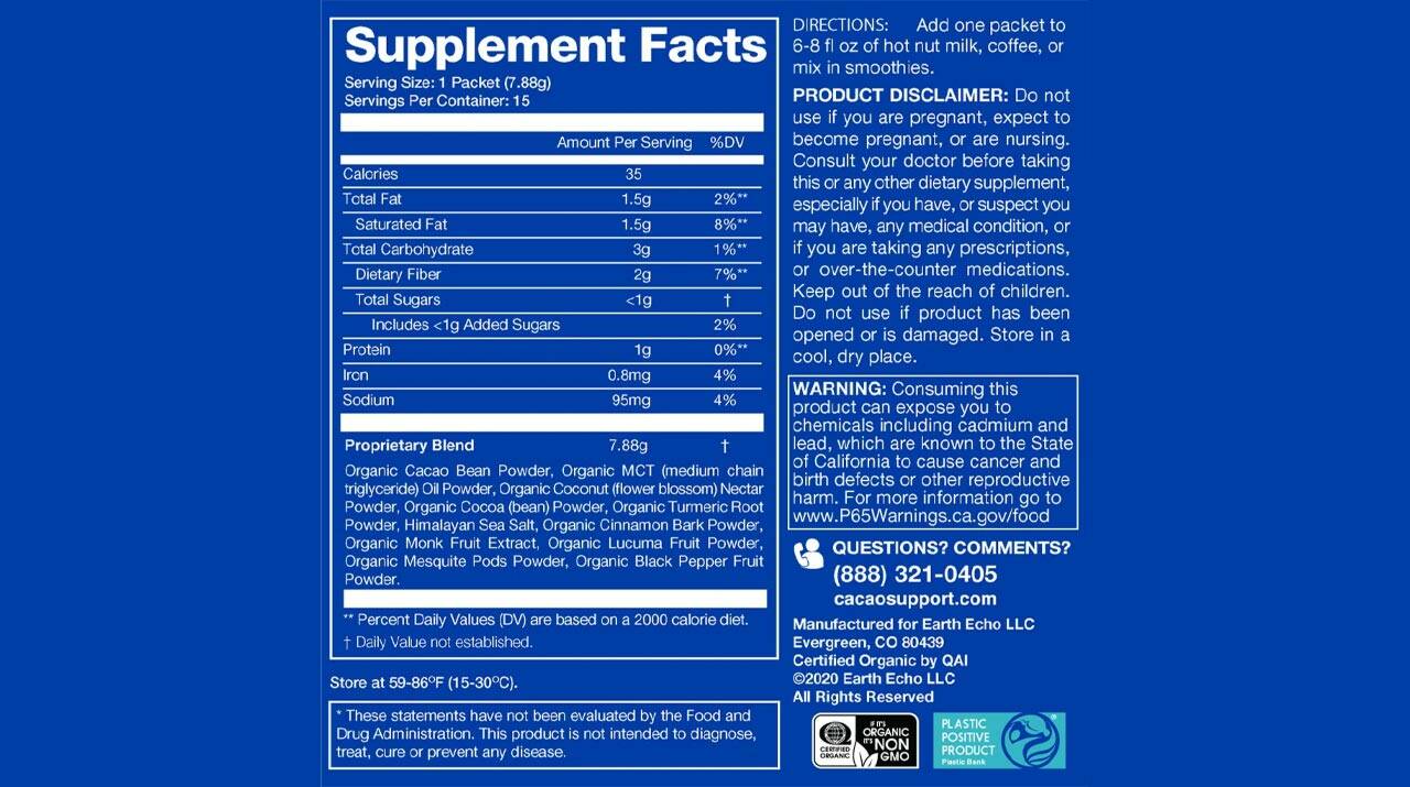 - The supplement contains organic cacao powder, turmeric, MCT oil, cinnamon, Himalayan sea salt, and organic monk fruit extract, among other natural ingredients.