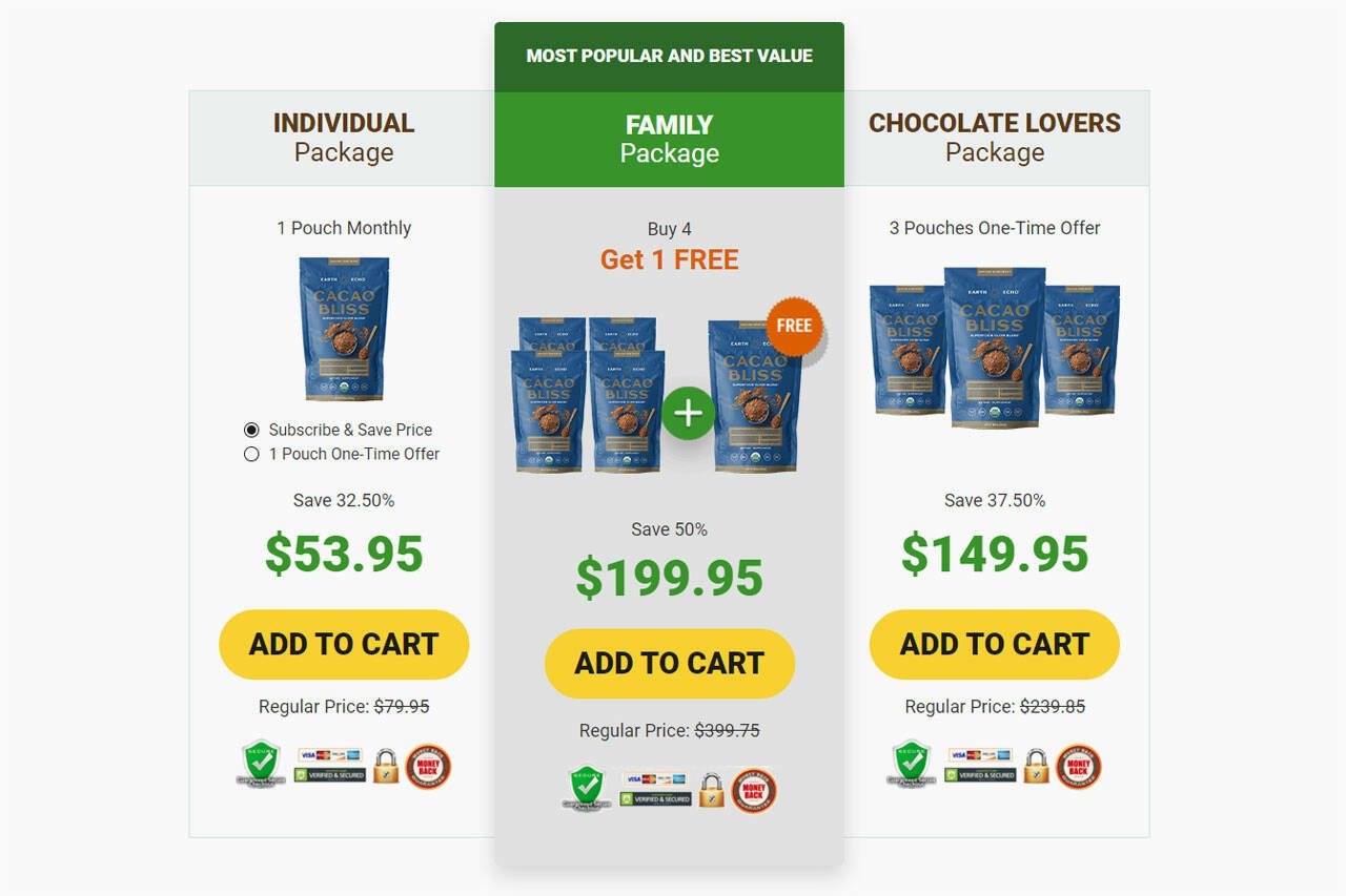 If you want to go all in and save the most amount of money while consuming this tasty supplement, consider investing in the 4-pouch pack of Cacao Bliss and get one pouch free! You will have to pay just $199.96 for this package, and a single pack will cost just $49.99.