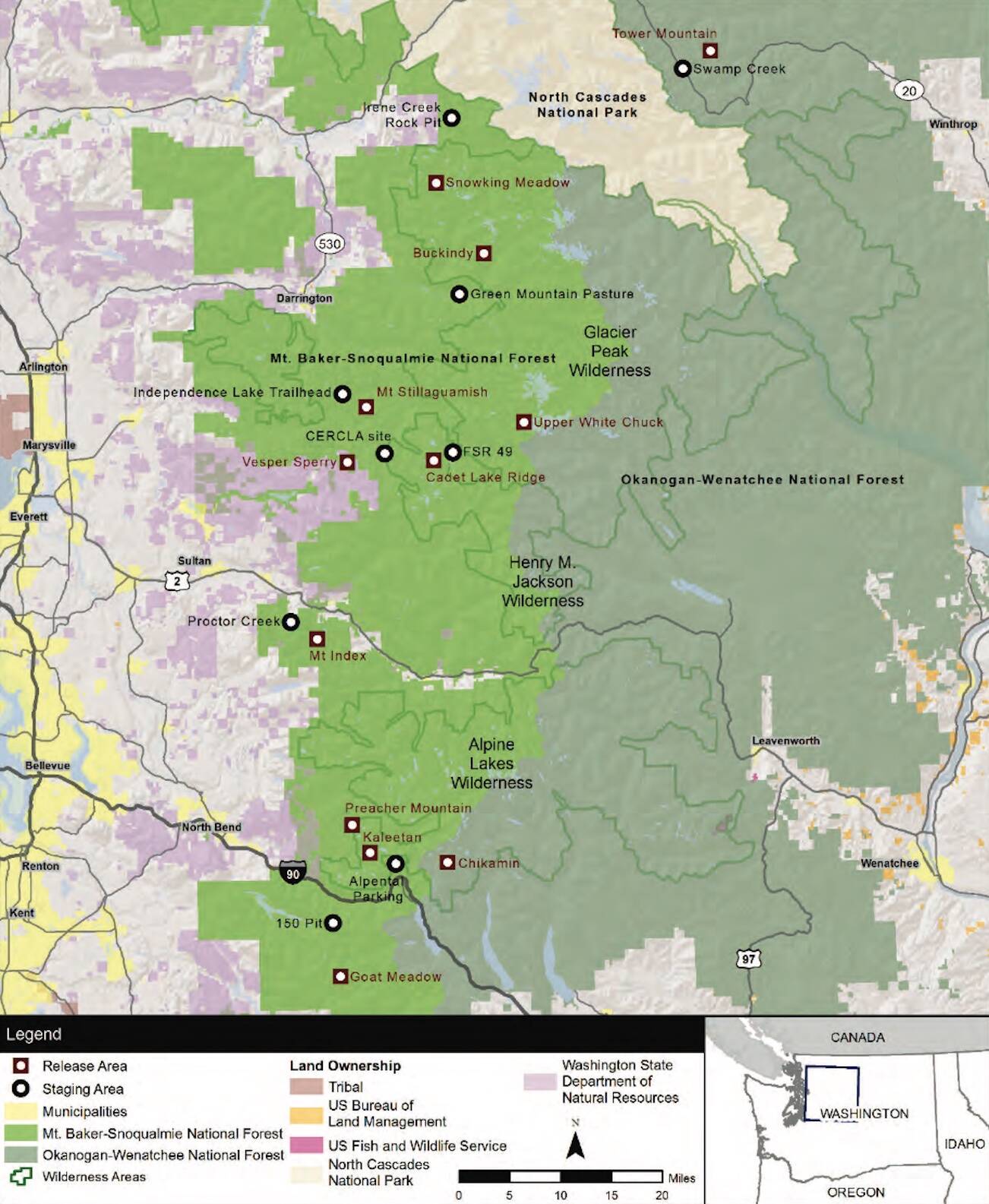 Then the animals were placed in crates and transported by truck and helicopter to Mount Baker-Snoqualmie and Okanogan-Wenatchee national forests.