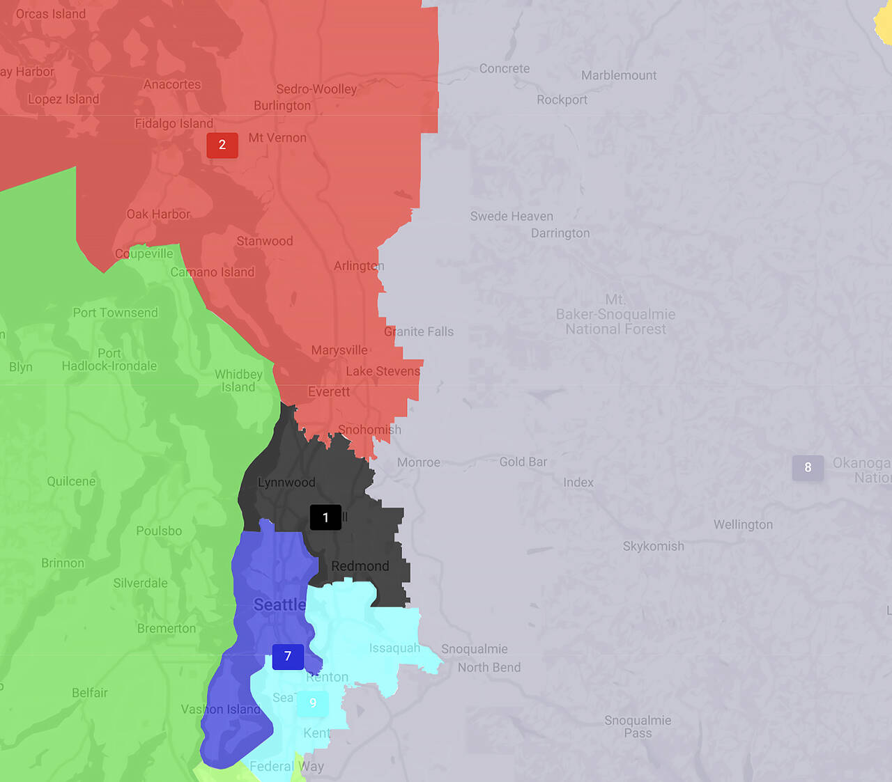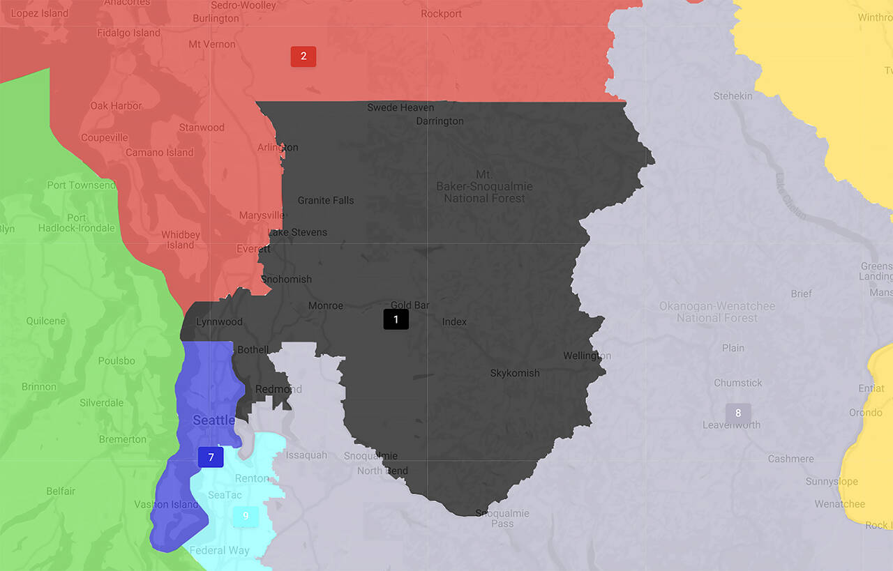 In their first-draft proposals, all four political cartographers push the 7th, served by Democratic Rep. Pramila Jayapal of Seattle, out of south Snohomish County. And the largest communities — Edmonds and Woodway — wind up in either the 1st or the 2nd, depending on the map-maker. The design of the 1st, now represented by Democrat Suzan DelBene of Medina, and the 2nd, represented by Democrat Rick Larsen of Everett, are in for some big changes based on the four preliminary maps.