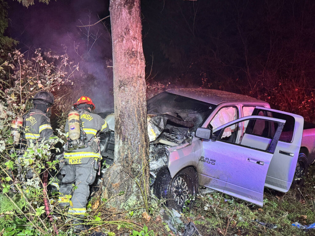 Around 5:38 a.m. Wednesday, the truck, traveling at highway speeds, was driving south in the 6300 block of Highway 9 when it left the roadway and hit a tree before bursting into flames, according to a Snohomish County Fire District No. 4 press release.
