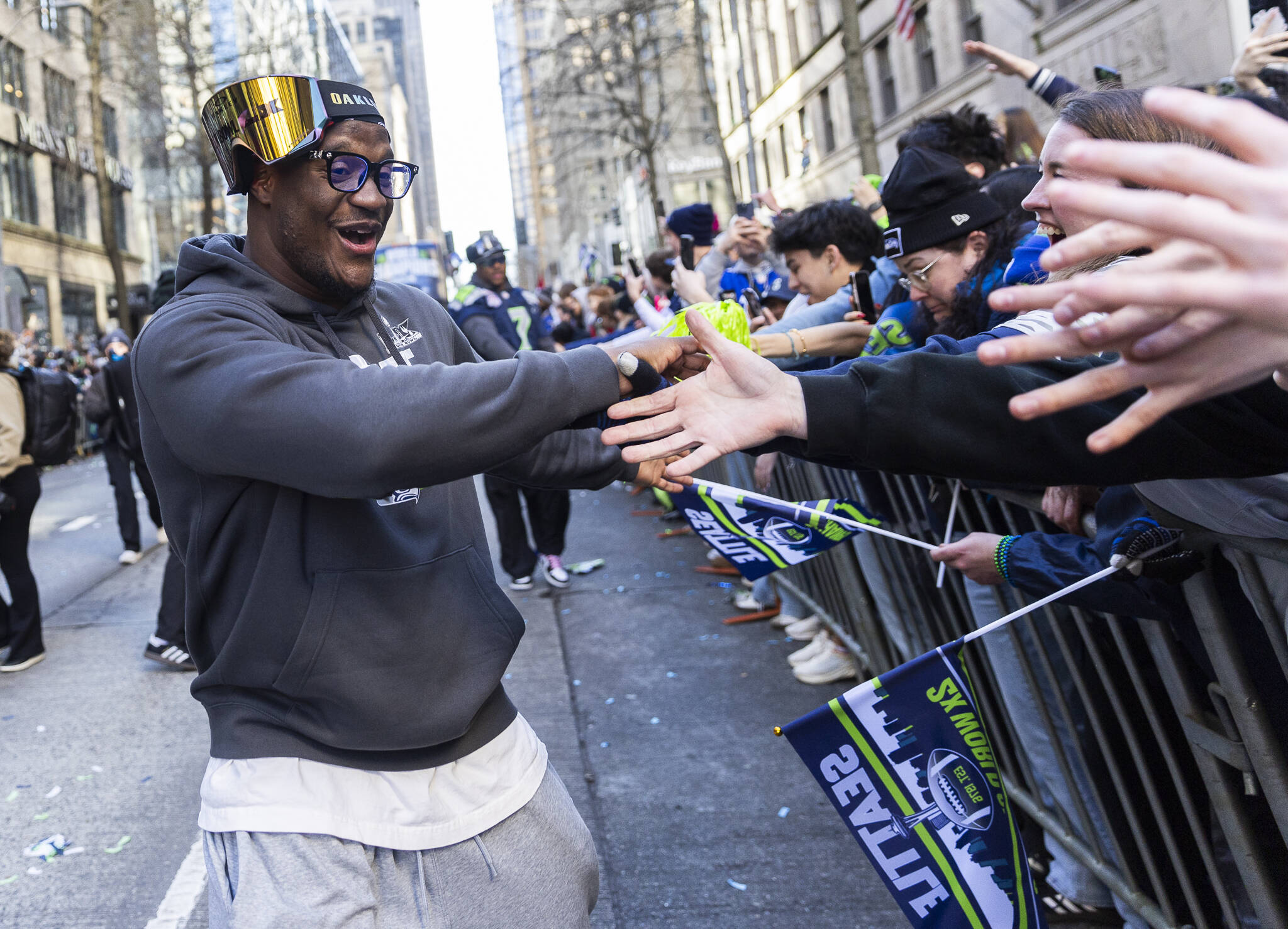 Seattle Seahawks’ Kenneth Walker III and Super Bowl MVP high-fives fans lined up along 4th Avenue during the Seahawks World Champions Parade on Wednesday, Feb. 11, 2026, in Seattle, Washington. (Olivia Vanni / The Herald)