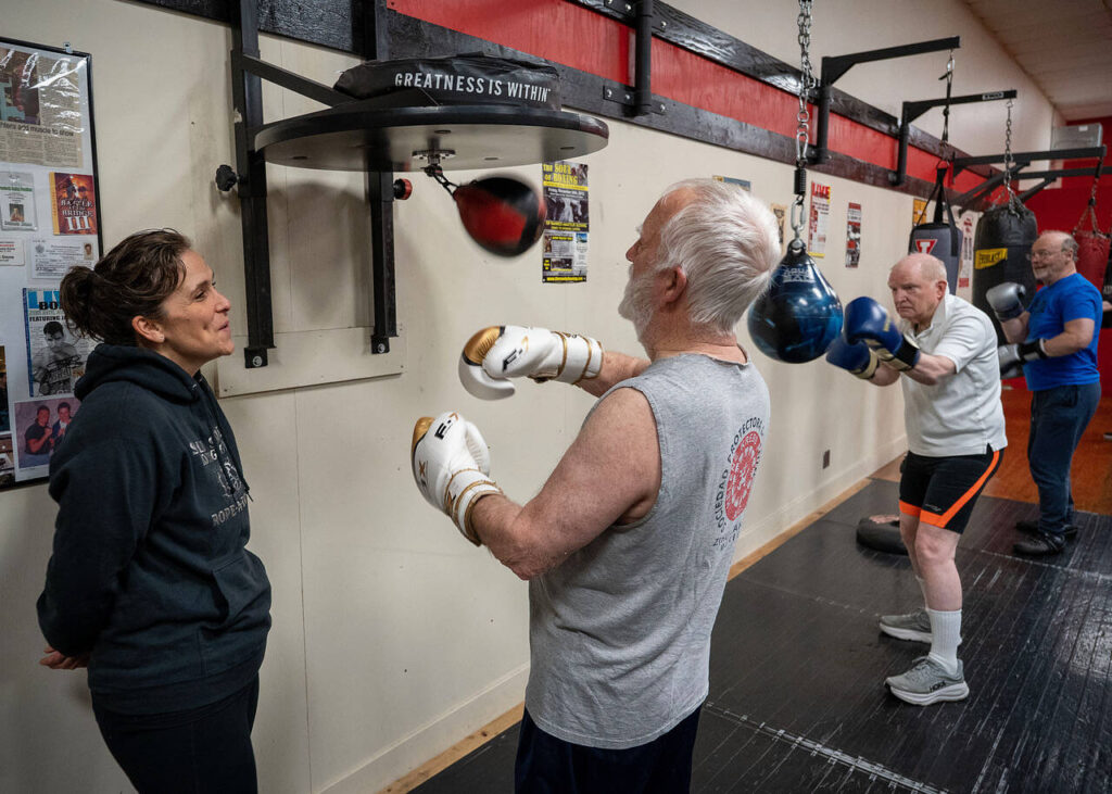 May Sinclaire, Stone’s mother, said the Parkinson’s classes are attended by the most dedicated group of people. But it’s also fun to see the men and women of the Golden Gloves class try to outdo each other and just as exciting to see the younger folks spar in the other classes.