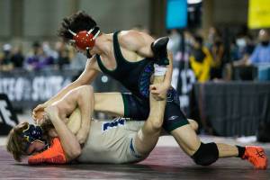 Arlington’s Trevor Latta wrestles Monroe’s Brian Zebley Jr. Saturday evening during the 3A Regional 1 boys wrestling tournament at Snohomish High School in Snohomish, Washington on February 12, 2022.  (Kevin Clark / The Herald)